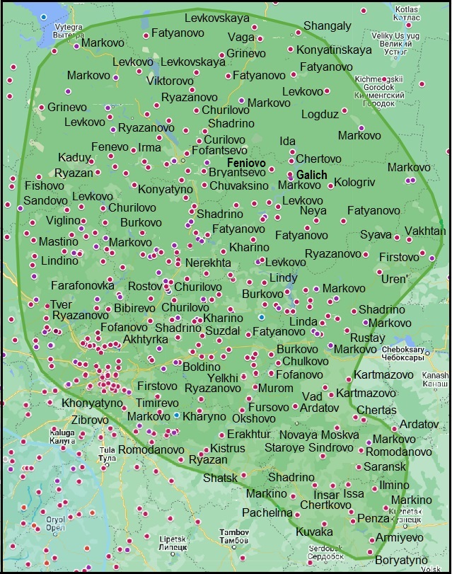 A lot of supposed Anglo-Saxon settlements are located near Moscow. In some places, the distance between neighboring settlements is only 5-10 km. In general, density is such that it eliminates the possibility of placing all the names on the map above. For this purpose, the larger scale map was used (see below).