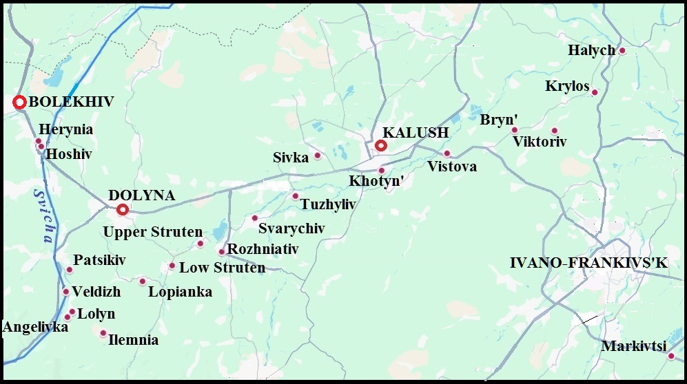We find one such chain in Western Ukraine, and it has the highest density of place names in Old English toponymy in continental Europe. It runs from the city of Halych to the city of Kalush and farther through the Kalush district of Ivano-Frankivsk Region in this order: