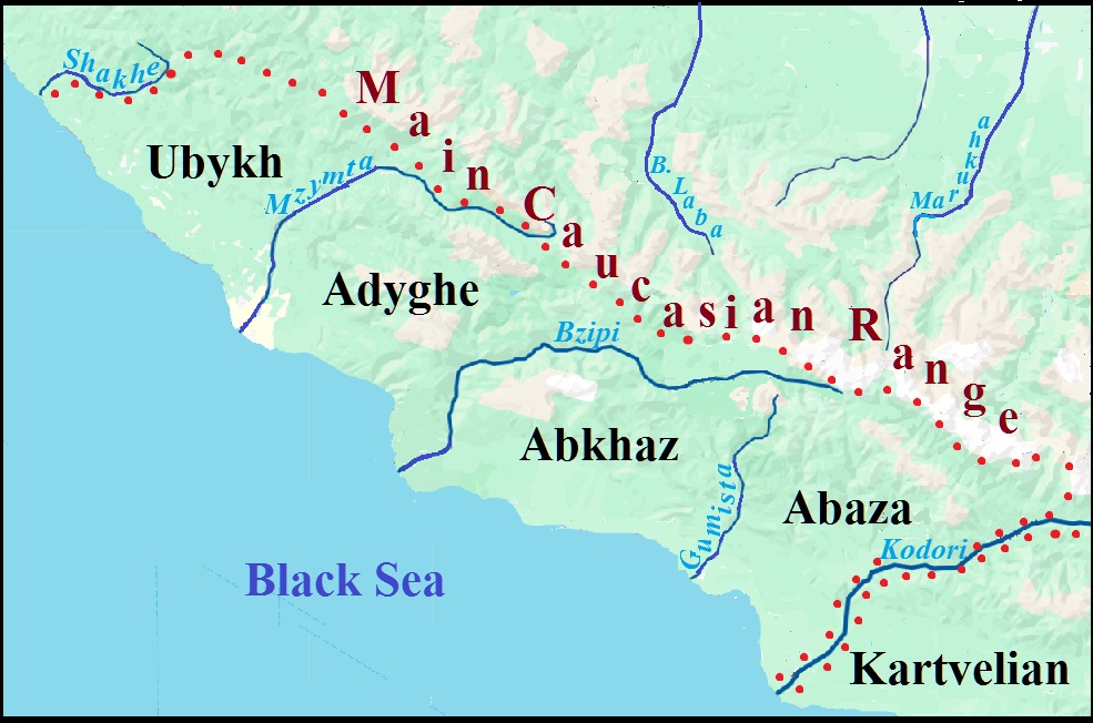Fig. 1. Areas of formation of the Abkhaz-Adyghen languages on the eastern coast of the Black Sea