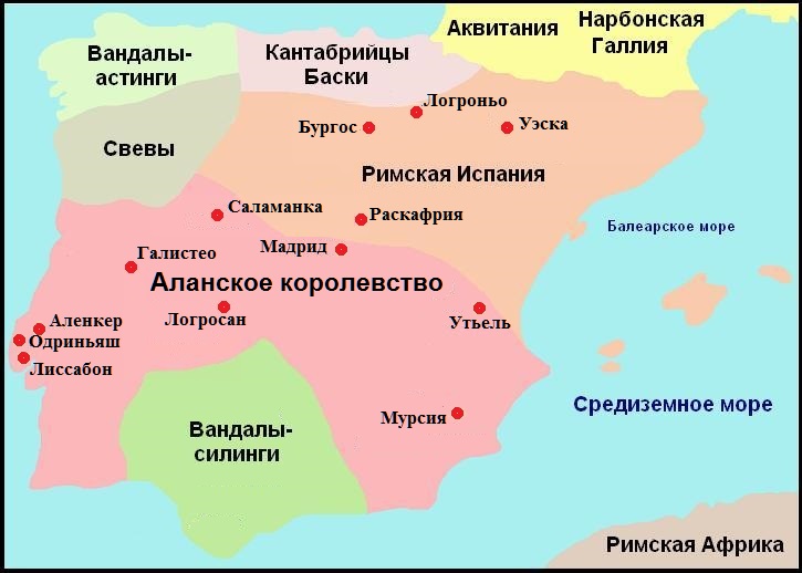 Вестготы, остготы, аланы, мигрируя под натиском гуннов в поисках свободной земли для поселения, двигались не единым потоком, а каждый из этих народов своим собственным путем и лишь временно объединяясь в военных целях. Даже аланы двигались по меньшей мере двумя разными группами, что затрудняет установление путей их миграций по историческим документам. Как всегда это имеет место при переселениях народов, их путь маркируется основанными поселениями, в которых по разным причинам остается часть мигрантов. Такое явление было обнаружено при переселениях древних булгар, кимвров, англов и саксов. Путь алан до Адрианополя отмечают города Варна (др.-анг. wearnian "предостерегать, охранять") и Бургас (др.-анг. burg "бург, замок") в Болгарии. Цепочку топонимов, которые могут маркировать путь дальнейшего движения алан после Адрианополя, составляют следующие: