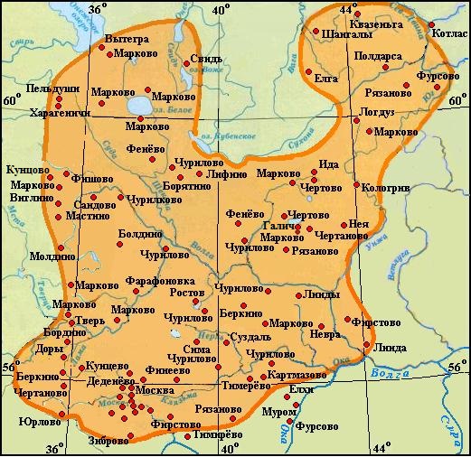Англосаксонське походження багатьох топонімів в Східній Європі досить прозоро для людей які володіють англійською мовою, але вони розкидані на великому просторі і тому їх чимала кількість залишається поза увагою. Якщо ж їх зібрати разом, вони справляють враження: Беркове, Бургове, Волфа, Голдине, Ліндине, Фастів, Фірстово, Фішово і багато інших менш очевидних. Найбільша щільність англосаксонських топонімів спостерігається на території колишнього Володимиро-Суздальського князівства особливо довкола Москви (див. Давня англосаксонська топонімія у континенальній Європі). З давніх-давен в цих місцях проживали фіно-угорські племена, а слов'яни просунулися сюди тільки в кінці першого тисячоліття н.е., але вже через сто років тут виникло Ростово-Суздальське князівство, яке швидко перехопило лідерство у Києва. Роль цього князівства в історії державотворення Росії оцінюється дуже високо: