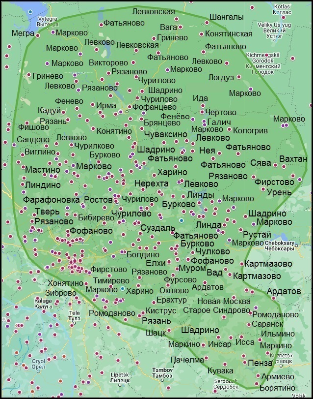 Ниже приводится карта Google, с обозначенными предполагаемыми англосаксонскими топонимами в Центральной России и даются наиболее убедительные расшифровки некоторых их них:
