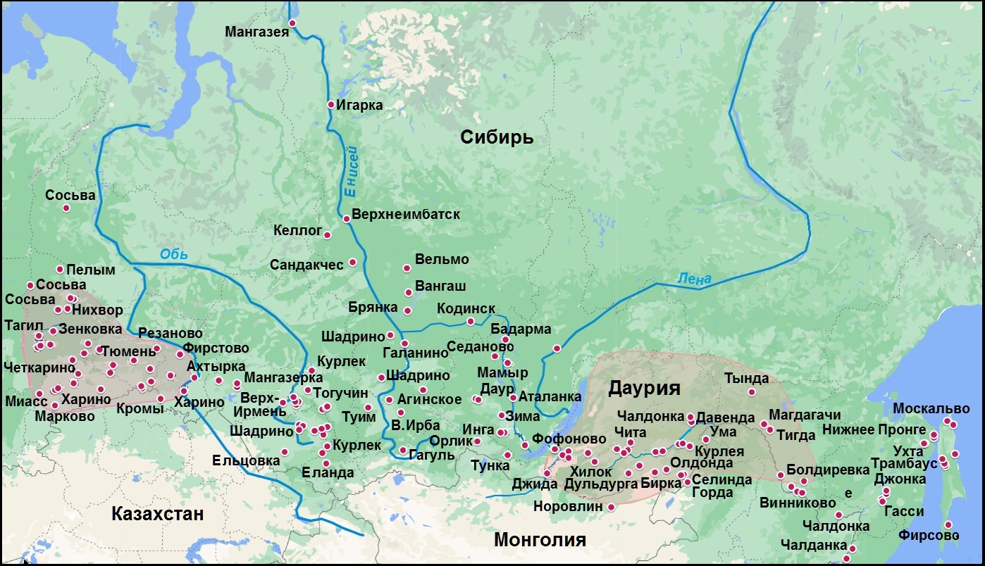 Территории Пелымского княжевства т Даурии тонированы розовым цветом.