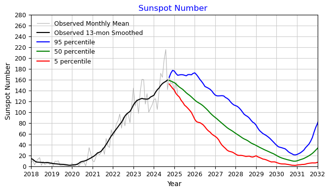 Метод оцінки використовується для прогнозування решти поточного циклу, але в даний час він не може передбачити наступний сонячний цикл. Однак для інженерних додатків та планування місій нижче наведено розширений прогноз на наступний сонячний цикл. Значення, показані для наступного циклу, є значення середнього циклу, отримані шляхом усереднення попередніх циклів 13-місячних згладжених індексів разом з розрахованими статистичними межами.
